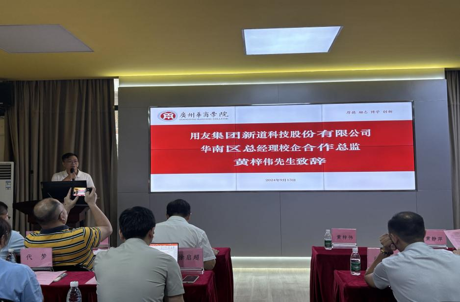 用友集团新道科技股份有限公司华南区总经理校企合作总监黄梓伟先生致辞,他强调产业班融入企业实践课程,这一举措充分体现了学院对培养应用型人才的高度重视。实践出真知,通过丰富的实践课程,学生们将有更多的机会将理论知识与实际操作相结合,提升自己的专业技能和综合素质。