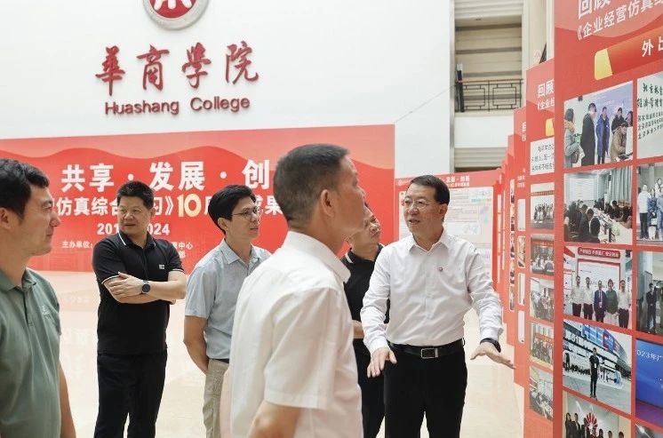 华商教育集团董事长廖榕就,学校总督学,党委书记陈玉欢,副校长刘少波、吕峻闽,学校顾问郭银华,广东财经大学国家级实验教学中心主任姚维保,副主任李立君,教学部部长陈韦伶,广东白云学院经管中心主任贺雪荣,3044永利集团登录会计学院、管理学院、人工智能学院等院系领导及师生,共同参观了《企业经营仿真综合实习》课程10周年成果展,见证了课程发展建设的阶段性“成绩单”。