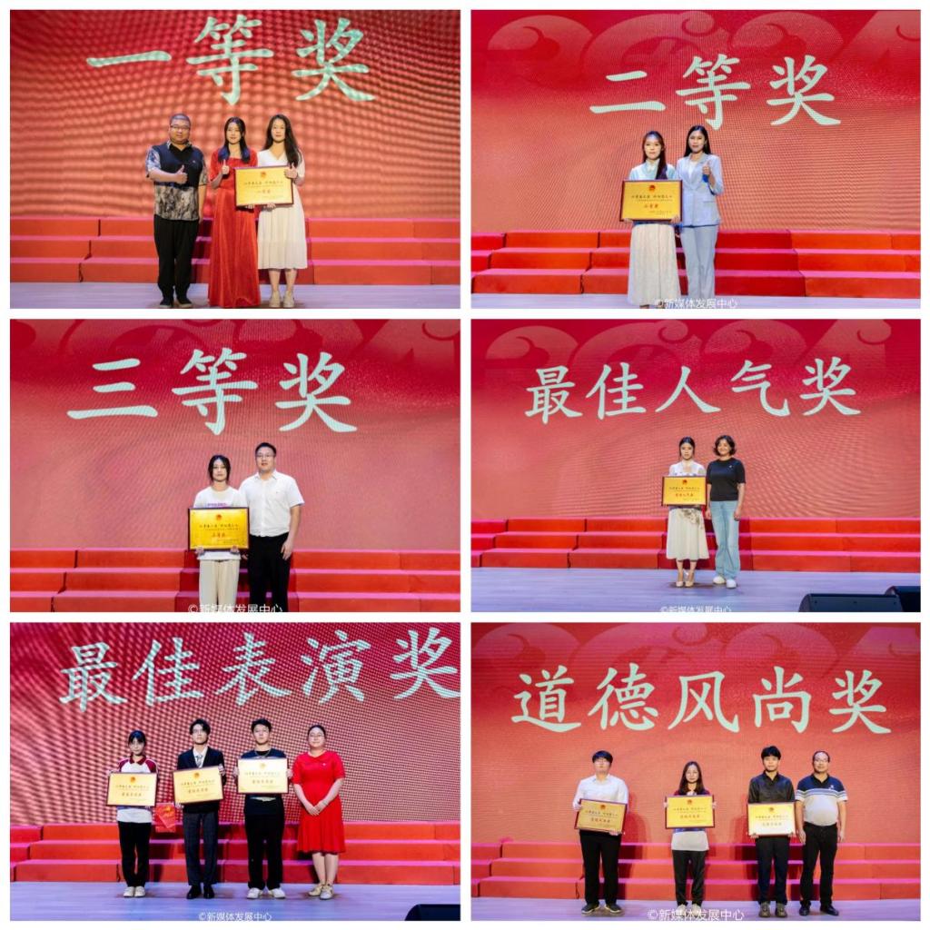 各二级学院派出的参赛队伍依次登台表演,展现出学院的风采与团队的凝聚力,他们演绎着经典的曲目,每一首歌都是一段灵魂的对话。经过激烈的角逐和评委们的认真审判,最终,教师教育学院凭借出色的表现荣获一等奖,会计学院荣获二等奖,传播与传媒学院荣获三等奖;同时,文学院获得最佳人气奖,传播与传媒学院、数据科学学院、外国语学院获得最佳表演奖,经济贸易学院、管理学院、金融学院获得道德风尚奖。