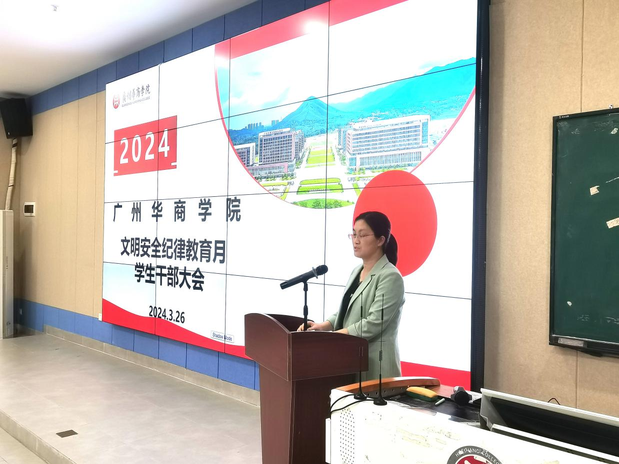 肇庆校区党委书记苏宁作总结讲话。他对全体学生骨干提出了三点要求:一是要做到知责于行,全体学生骨干要以身作则,时刻关注校园周围存在的隐患并及时上报给有关部门处理;二是担责于行,全体学生骨干要树立个人形象,带动周围同学守职、守纪、守法;三是要做到履责于行,全体学生骨干应让自己成为校园文明安全的守护者。