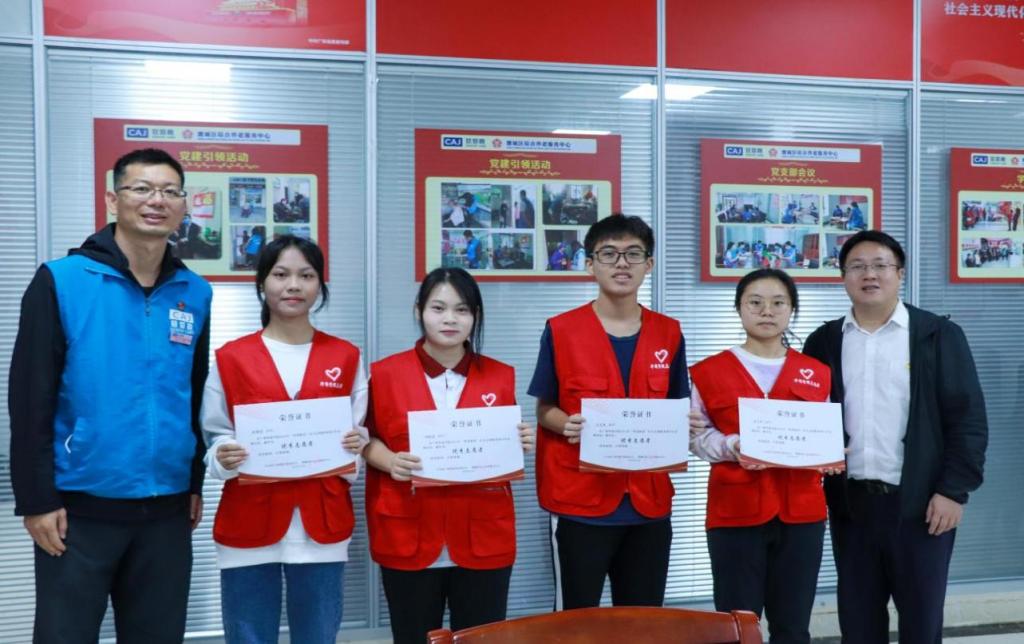 颁发感谢状及授牌。慈爱嘉养老服务中心党支部徐新年书记、校团委陈刚书记为我校优秀志愿者代表颁发感谢状。慈爱嘉养老服务中心党支部徐新年书记、荔城街综合养老服务中心何丽珊主任为我校“智慧助老”项目指导老师夏仲颁发感谢状。