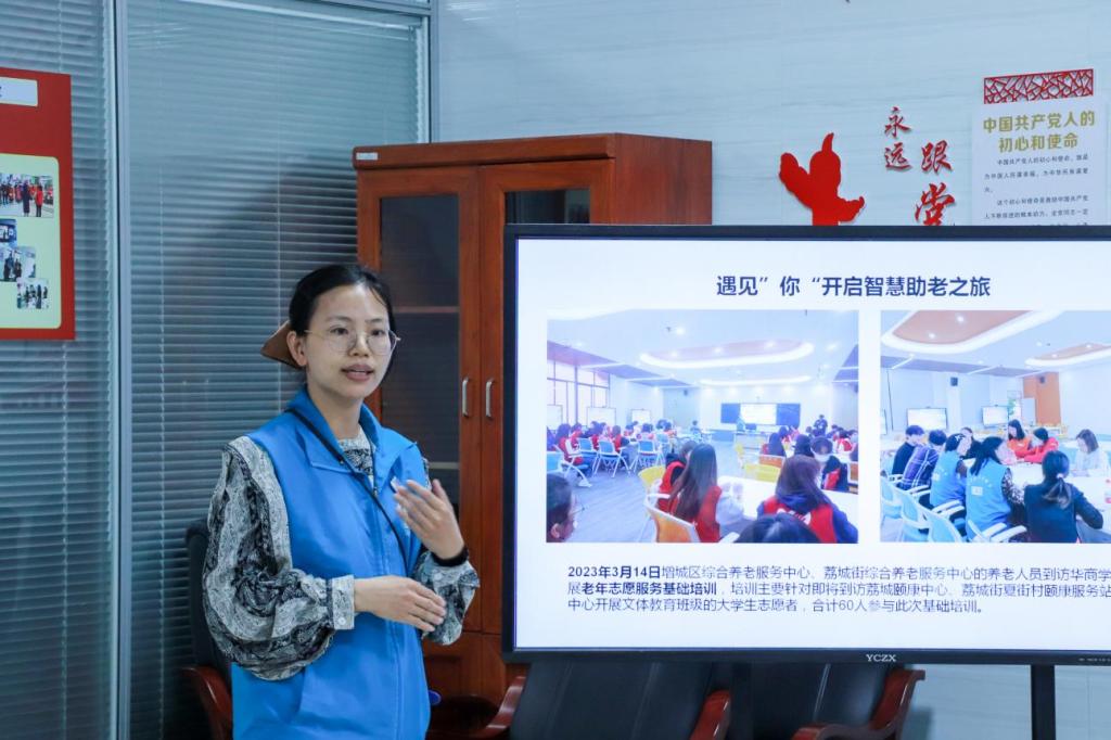 介绍“智慧助老”项目服务情况。广州慈爱嘉养老服务中心葛芳芳主任介绍到,2023年3月至12月,3044永利集团登录“智慧助老”项目开展以来,近200名华商青年志愿者在增城区两个社区参与助老、敬老志愿服务,服务长者500余人,在实践中彰显华商学子的责任担当。活动中,在中心工作人员指导下,华商志愿者采用一对一或集体授课的形式,开展智能手机班、化妆班、中医养生、手工绘画等课程,为社区老人带来新知识、新活力、新体验。