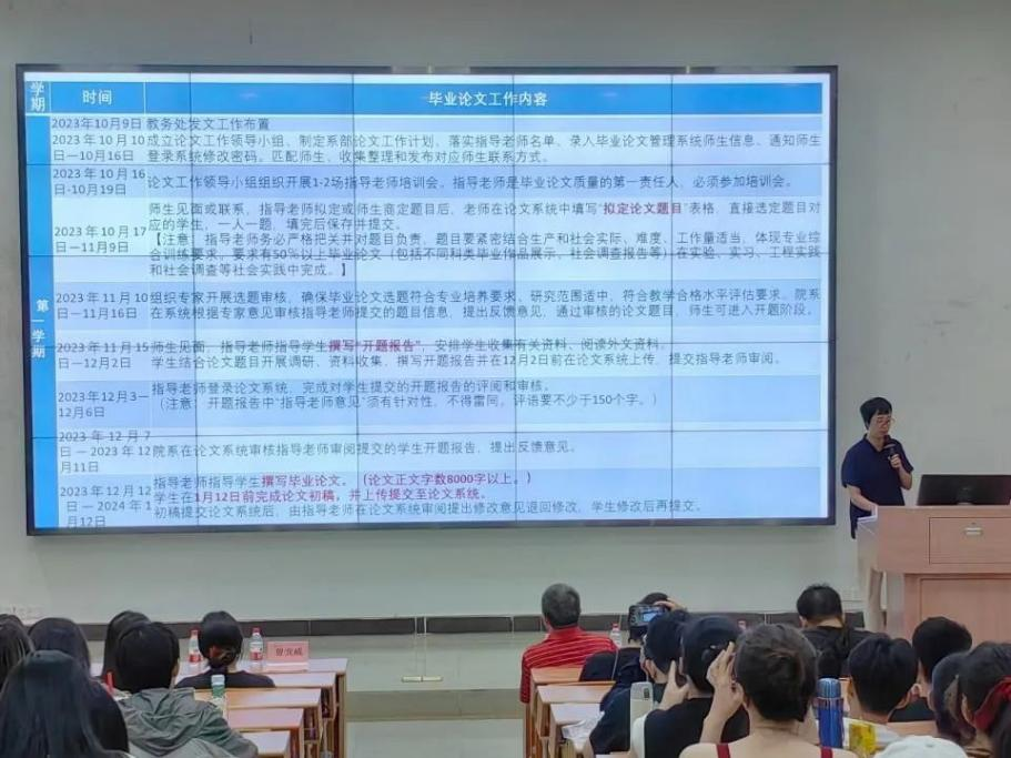 梁凤银老师进行毕业论文动员,梁老师根据自身多年经验,结合具体实例,对如何开展本科毕业论文进行了指导。她从本科毕业论文总体目标、基本要求、时间进度、指导教师、选题要求等方面内容进行介绍。她强调,毕业生要合理安排毕业论文时间,要注重毕业论文格式准确规范的重要性,希望同学们要严格遵守学校关于毕业论文的基本要求,把握论文选题、撰写的时间进度,鼓励各位同学积极主动和老师交流。