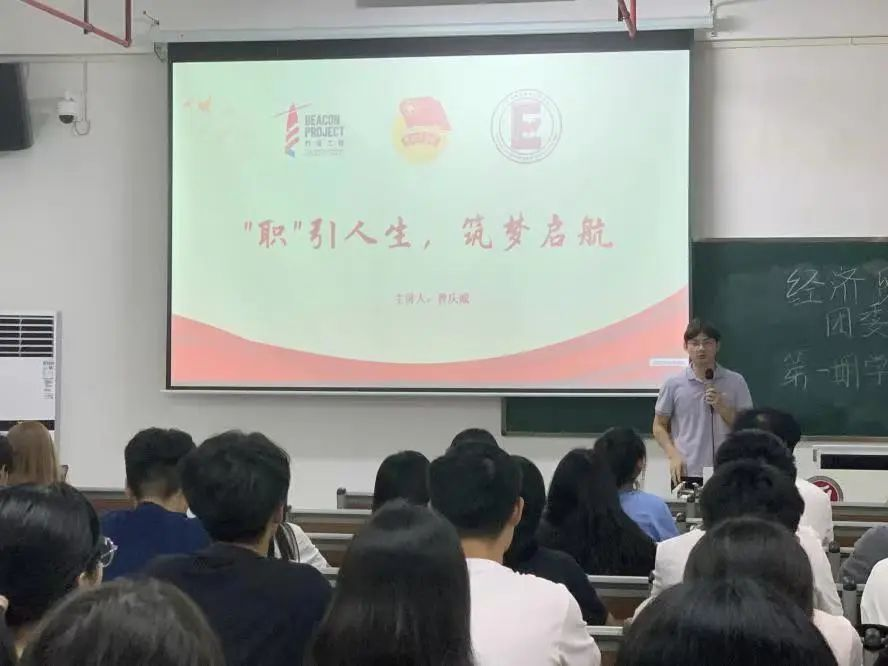会议上,曾庆威老师围绕“职”引人生,筑梦启航的主题为同学们开展了主题团课,增强大学生生涯规划意识。在这个快速发展的时代里,职业选择是我们面临的重要抉择之一。然而,许多人常常陷入迷茫,不知道自己应该从事什么样的职业,或者如何在工作中获得成就感和满足感。