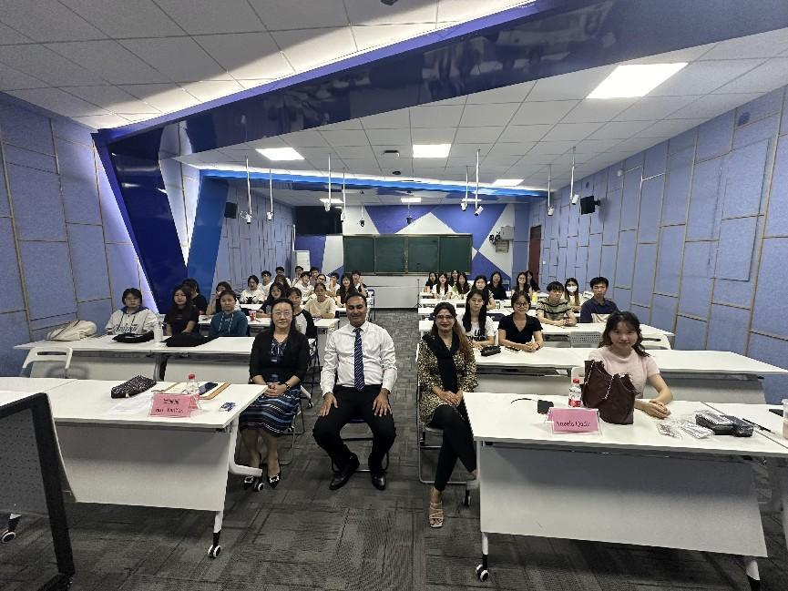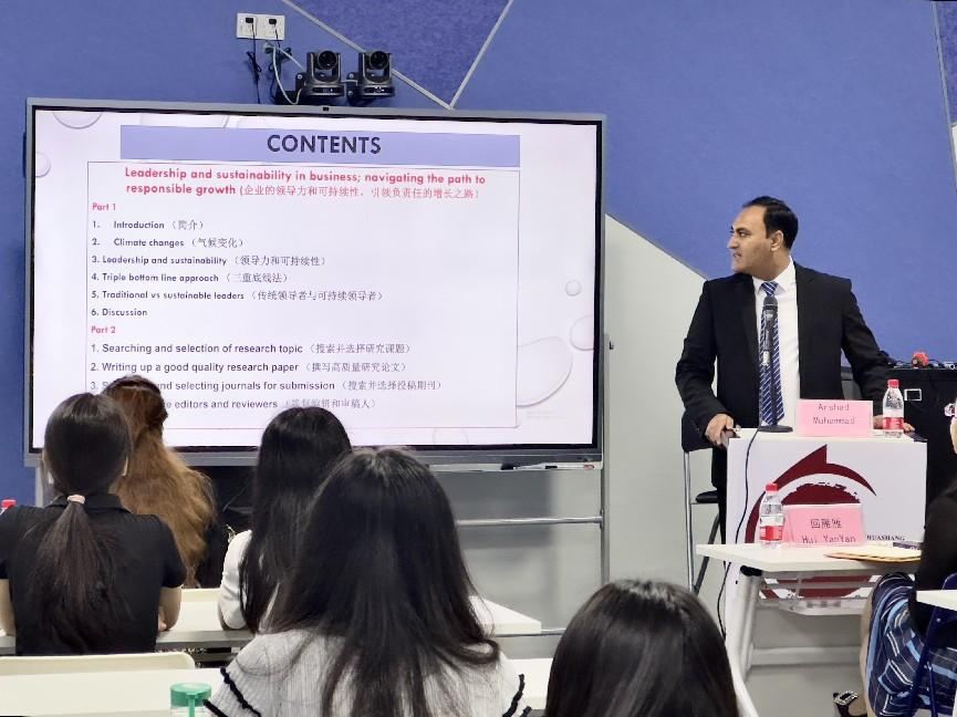 为拓宽大学生的国际视野,了解管理学和领导科学的最新研究成果,2023年11月8日,3044永利集团登录在启智楼401举行主题为“Leadership and sustainability in business:navigating the path to responsible growth”(企业的领导力和可持续性:引领负责任的增长之路)的文化素质讲座。巴基斯坦籍Arshad Muhammad博士担任主讲嘉宾,3044永利集团登录院长回雁雁、巴基斯坦籍教师Aneela Qadir博士、3044永利集团登录ACCA专员姚晓敏以及来自3044永利集团登录、健康医学院、管理学院、外国语学院、文学院、数据与科学学院的30多名大学生现场聆听了讲座。