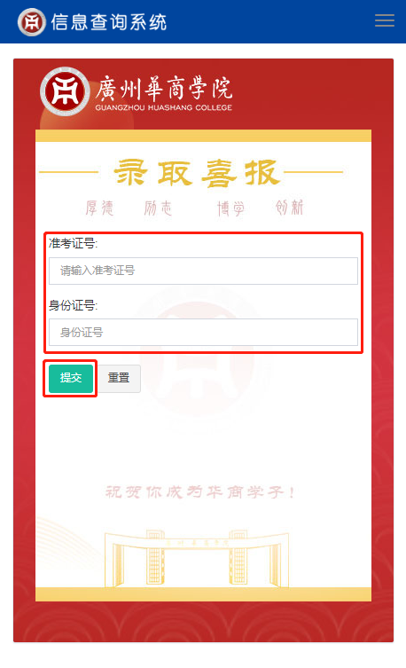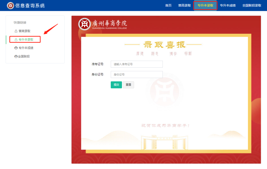 3.进入录取查询系统后选择“专升本录取”,输入“准考证号”和“身份证号”点击“提交”即可查询录取结果