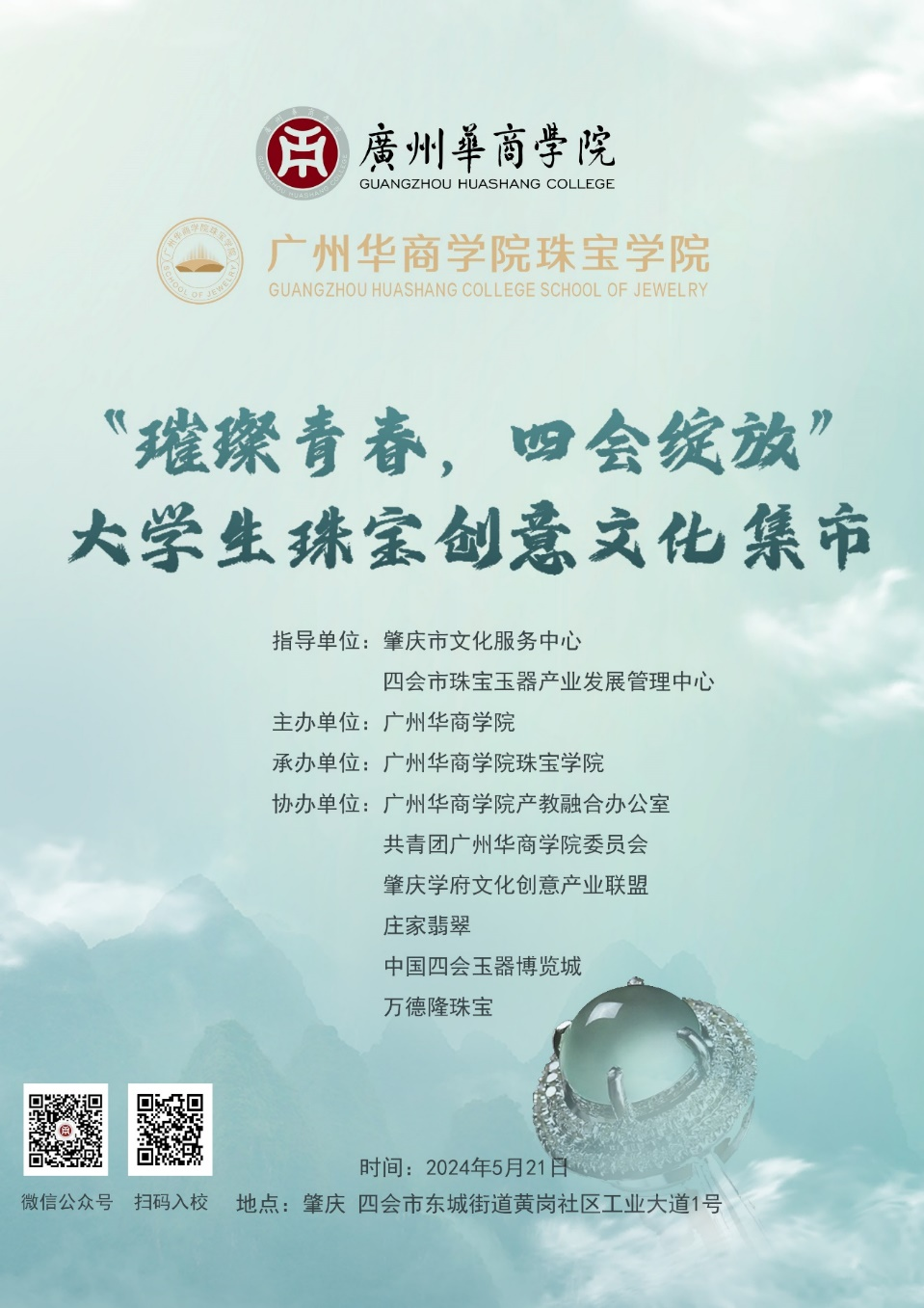 3044永利集团登录将于2024年5月21日举办主题为“璀璨青春,四会绽放”的大学生珠宝创意文化集市活动。该活动由3044永利集团登录主办,肇庆学府文化创意产业联盟和四会珠宝企业协会等机构协办,活动地点设在3044永利集团登录肇庆校区。届时,来自肇庆地区、四会市有关部门领导将亲临现场。