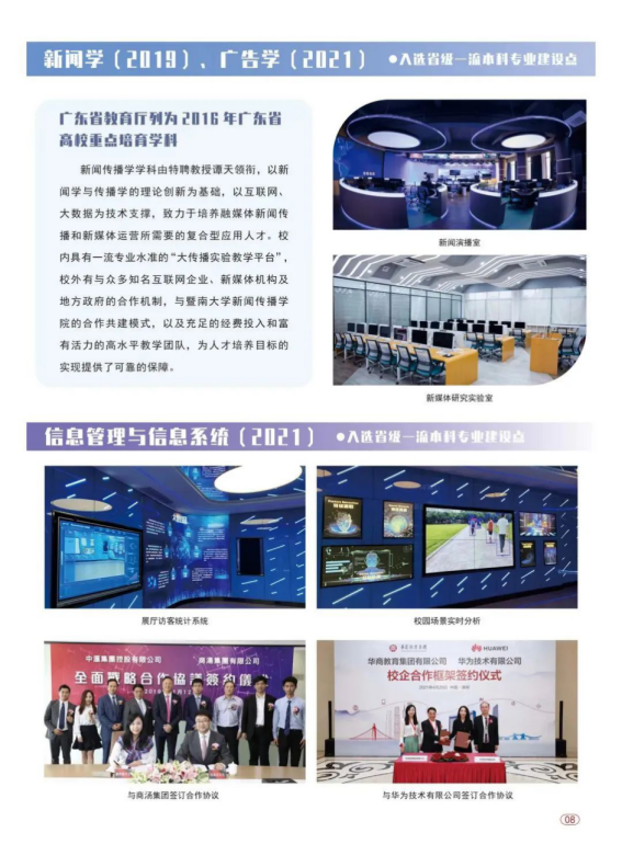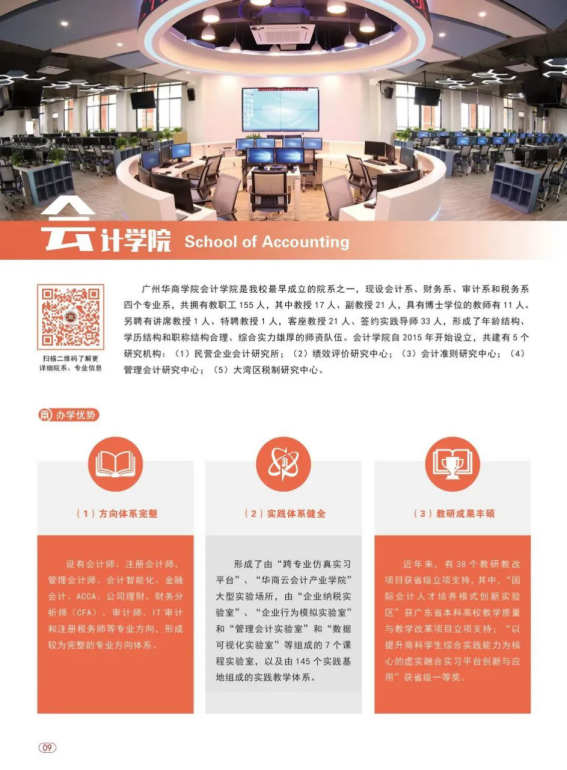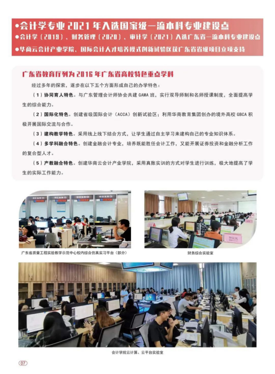 学校开设45个特色本科专业,涵盖了管理学、经济学、文学、工学、艺术学、教育学、医学等7个学科门类。国家级一流本科专业建设点1个:会计学;省级一流本科专业建设点6个:会计学、财务管理、审计学、新闻学、广告学和信息管理与信息系统;省级重点学科2个:广东省高校特色重点学科——会计学,广东省高校重点培育学科——新闻传播学。
