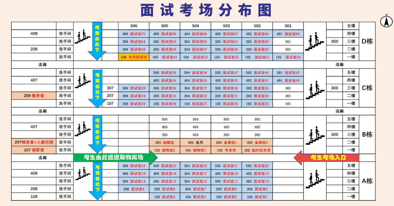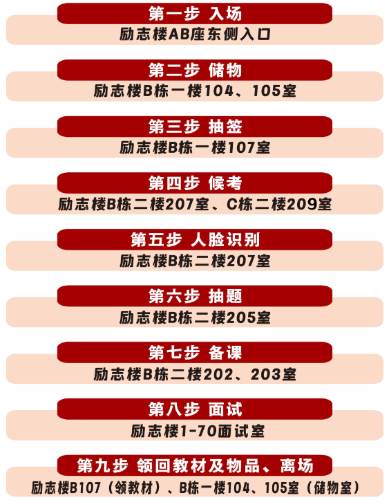 注意:请按指引先储物,只允许带身份证、准考证、教材,严禁携带手机、电子产品等禁带物品进入候考室。其他物品存放在储物室,面试后凭号码牌取物,否则将按照作弊处理。