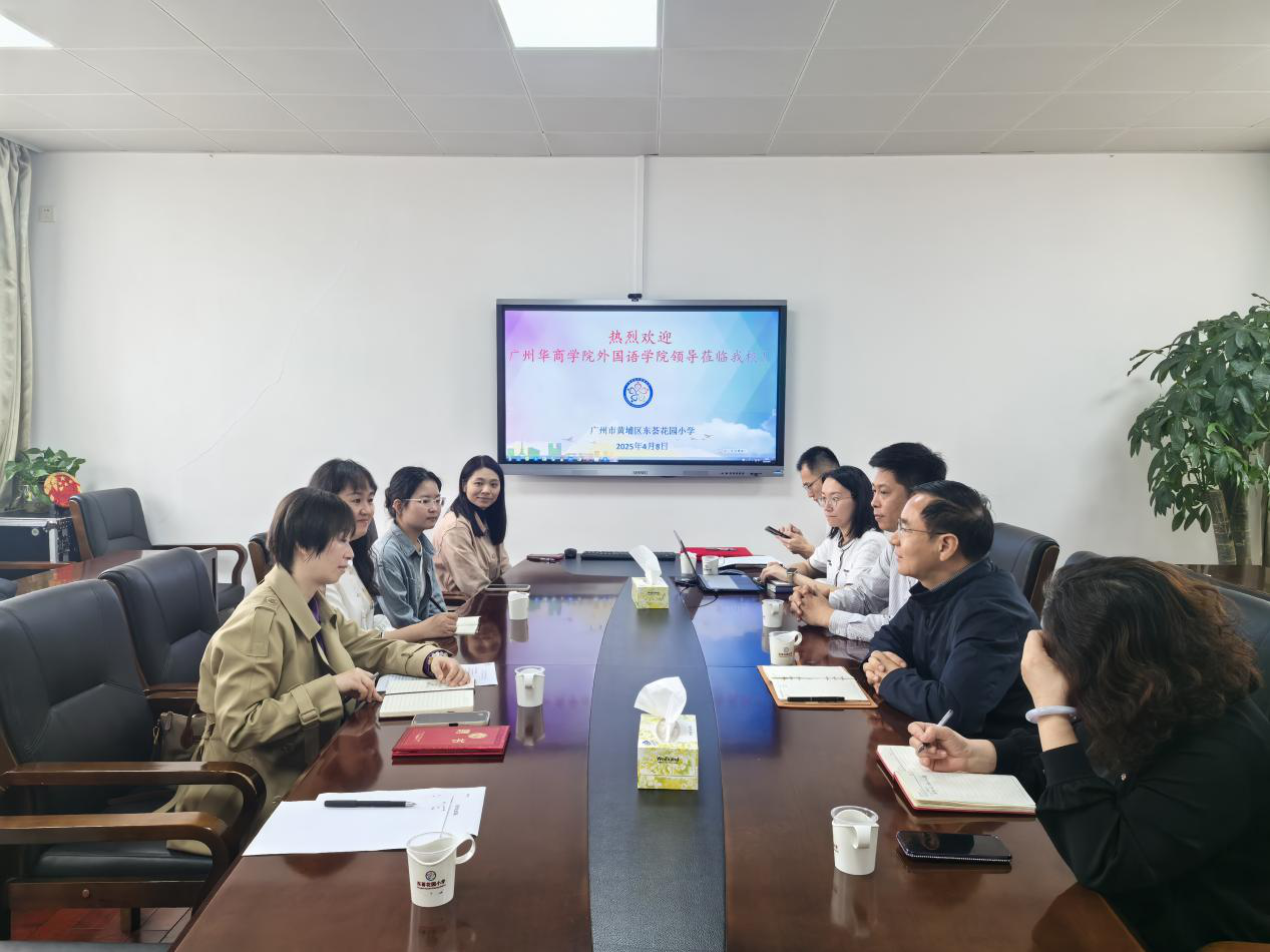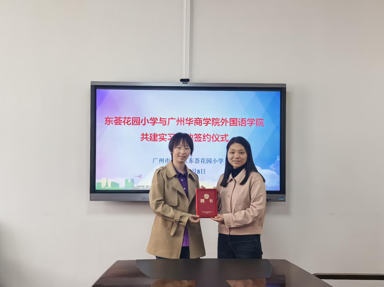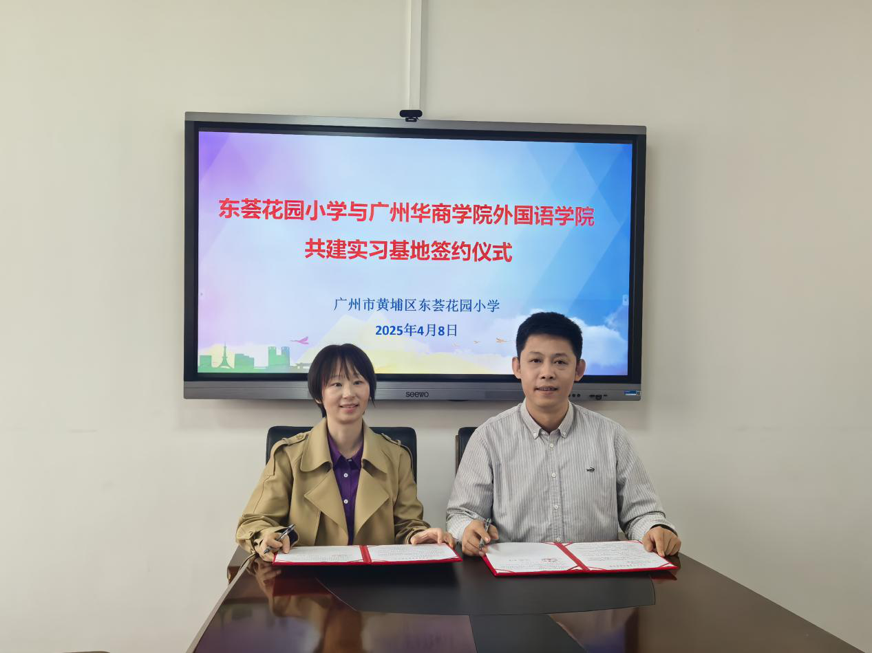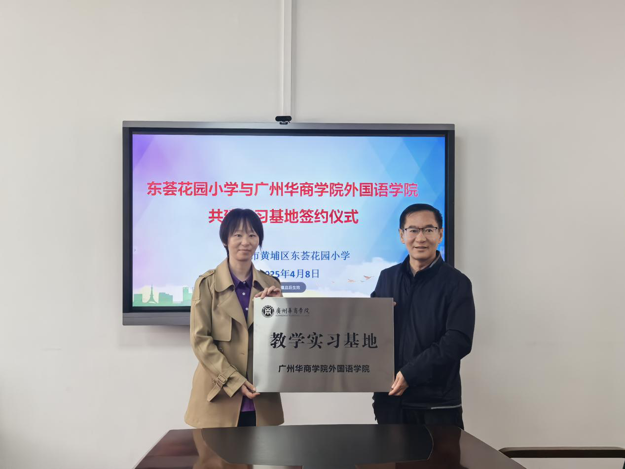 2025年4月8日上午,外国语学院一行前往黄埔区东荟花园小学共同举行共建实习基地挂牌仪式。黄埔区东荟花园小学郭云海书记、李晓宇校长、区笑霞副校长、教导处魏巧璐副主任、沈晓泽老师和实习指导教师,以及华商学院外国语学院甄玲副院长、郭宇洁老师、肖茜老师和本学期实习生共同参与了此次活动。