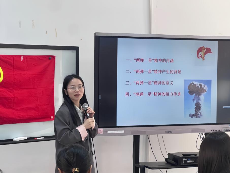 本次宣讲活动旨在学习“两弹一星”相关历史事件,传承和弘扬“两弹一星”精神。郝自秀同志围绕“两弹一星”精神内涵、产生的背景、意义与接力传承四个方面展开, 她以提问的方式引出“两弹一星”的概念,同学们认真思考并积极回答。她通过列举邓稼先、钱学森、钱三强等伟人事迹,指出“两弹一星”精神内涵:热爱祖国、无私奉献的精神,自力更生、艰苦奋斗的精神,以及大力协同、勇于登攀的精神。