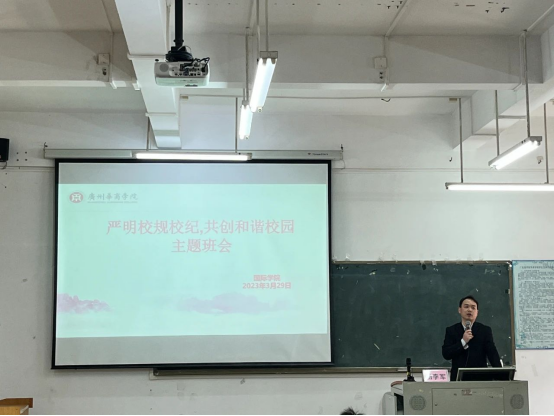 大会第一项议程,杨李军老师就本次动员大会主题“严明校规校纪,共创和谐校园”进行动员宣讲。