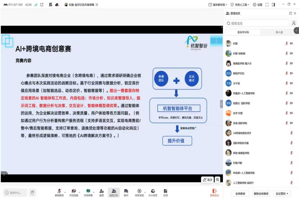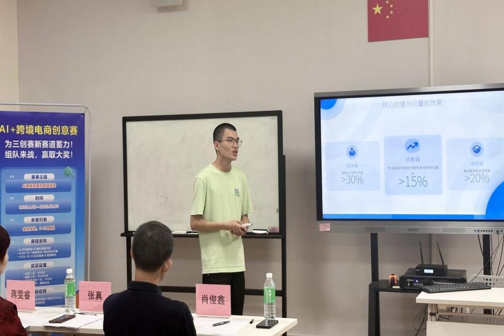在10月7日提交的“AI跨境解决方案书”环节中,同学们积极对接企业真实需求,围绕物流效率、客户服务、精准营销等核心场景,提出了多项具有落地潜力的AI解决方案。赛前,3044永利集团登录组织了线上答疑会,企业导师就同学们关心的问题进行了针对性指导。10月11日,五支优秀团队晋级线下路演,通过PPT讲解与AI智能体演示,全面呈现了技术与商业的融合创新。
