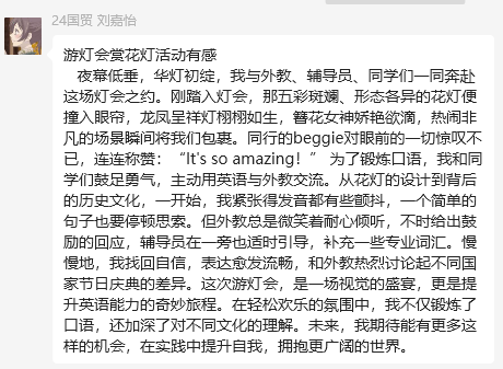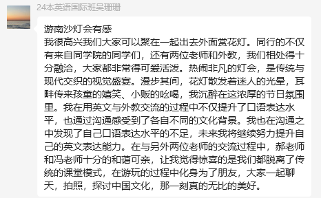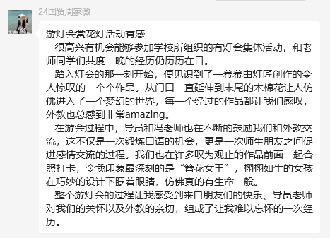 此次文化探索之旅为师生们搭建了一座跨文化对话的桥梁。中国学生们在实践中真切体会到:用英语诠释花灯背后的民俗典故、向国际友人解析传统纹样的象征意义,不仅是一次语言能力的淬炼,更是文化自信的生动体现。外籍教师们则通过可触摸、可互动的灯艺作品,领略到中华美学"道器合一"的哲学智慧——那些流转的光影间,既凝固着千年的文化基因,又跳动着当代创新的脉搏。