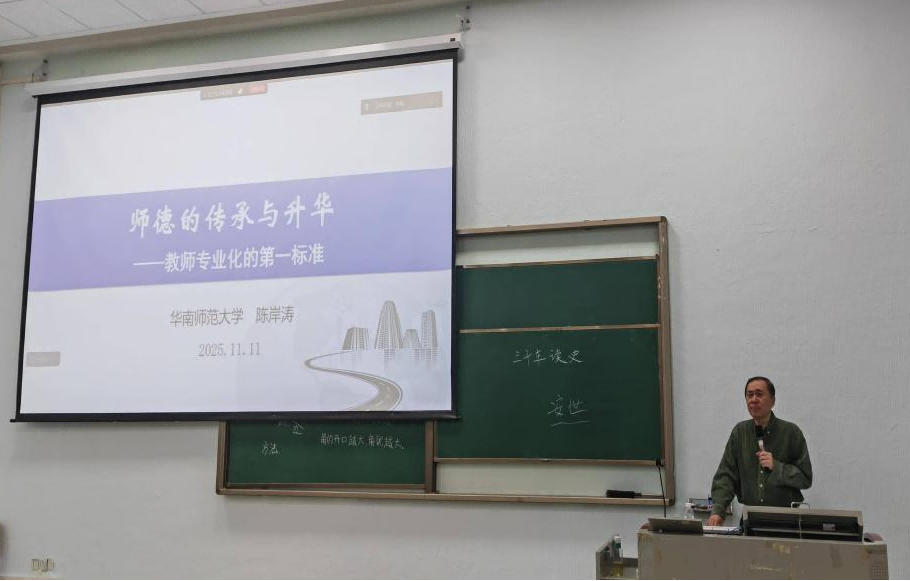 随后,华南师范大学陈岸涛教授以幽默风趣的语言和深入浅出的方式,立足国家教育战略,结合正反两方面典型案例,系统阐述了新时代师德师风建设的重要性与实践路径。他通过解读教育界先进事迹,生动诠释了“四有”好老师的内涵,并强调“师德是教师评价的首要标准”,必须贯穿教师职业发展全程。陈岸涛教授特别指出,师德的传承并非简单复刻,而是要汲取中华优秀传统文化中的教育智慧,将“立德树人”根本任务融入教育教学全过程。他借助云南农业大学周勇教授等先进典范与少数反面案例的鲜明对比,着重强调:“教师职业的特殊性,要求其职业道德水平必须高于社会其他职业,教师不仅要传授知识,更要塑造灵魂、塑造生命。”