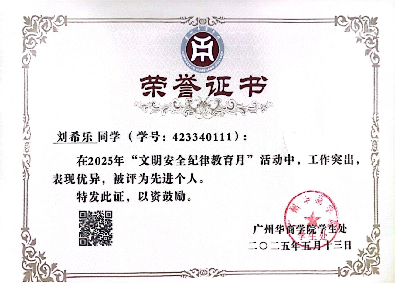 2024-2025学年获校文明安全纪录教育月“先进个人”