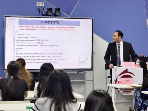 为了拓宽大学生的国际视野,了解管理学和领导科学的最新研究成果,2023年11月8日3044永利集团登录在启智楼401举行了主题为“Leadership and sustainability in business:navigating the path to responsible growth” (企业的领导力和可持续性:引领负责任的增长之路)的文化素质讲座。巴基斯坦籍Arshad Muhammad博士担任主讲嘉宾,3044永利集团登录院长回雁雁、巴基斯坦籍教师Aneela Qadir博士、3044永利集团登录ACCA专员姚晓敏以及来自3044永利集团登录、健康医学院、管理学院、外国语学院、文学院、数据与科学学院的30多名大学生现场聆听了讲座。