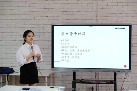 吴子琼分别从学生骨干经历、学生骨干的作用、个人经验总结三个方面进行宣讲。通过丰富有趣的图片及亲身经历的故事,她让同学们更好地认识到做志愿活动的重要性:既能丰富校园生活,又能拓展视角。