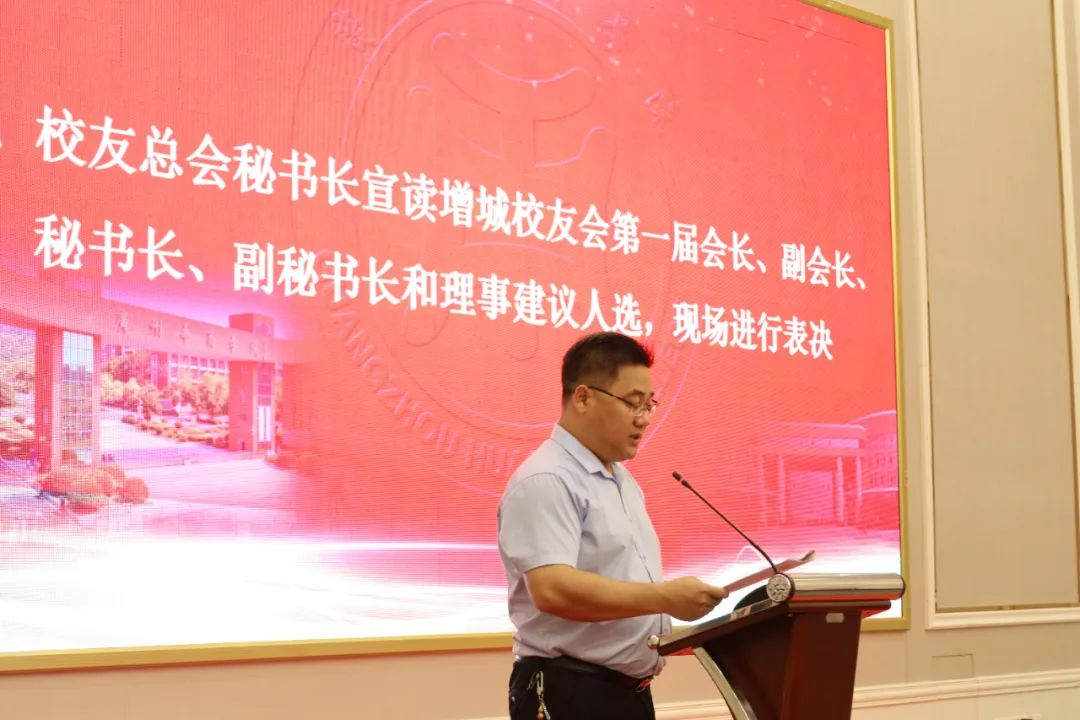 校友总会秘书长黄国富宣读了增城校友会第一届理事建议人选,并经大会表决一致通过名单草案。侯意雄任增城校友会会长,区晓莹、陈日班、胡世柯、李旭伟担任副会长,以及其他秘书长、副秘书长、常务理事、理事等共计39名校友成为第一届理事会成员。