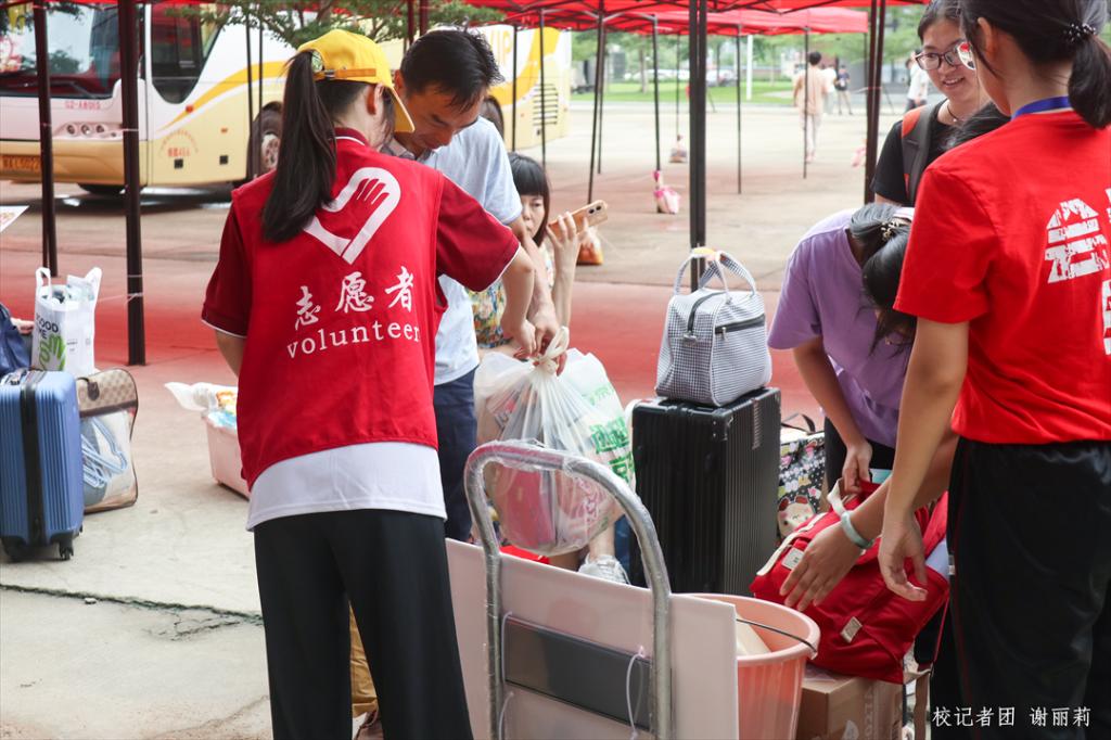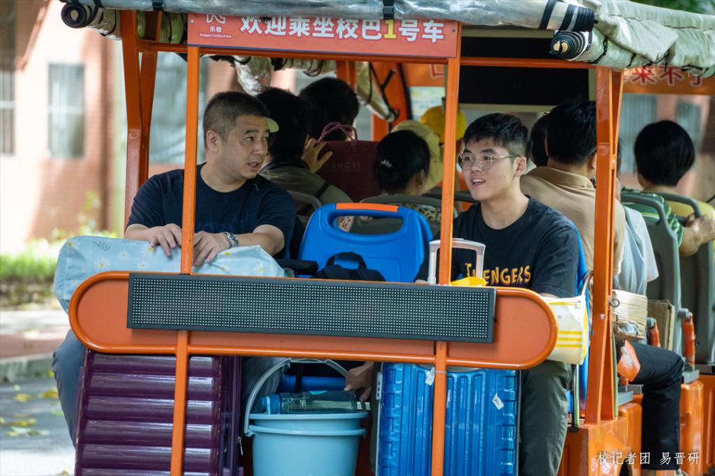 在这个秋意浓浓的雨天,新生和家长不必担心行李问题,因为我们提供了心贴“新”一站式服务,不仅有大巴车往返宿舍楼-报到点接驳新生及家长,随处可见的教职工及学生志愿者也满怀热情,指引新生。