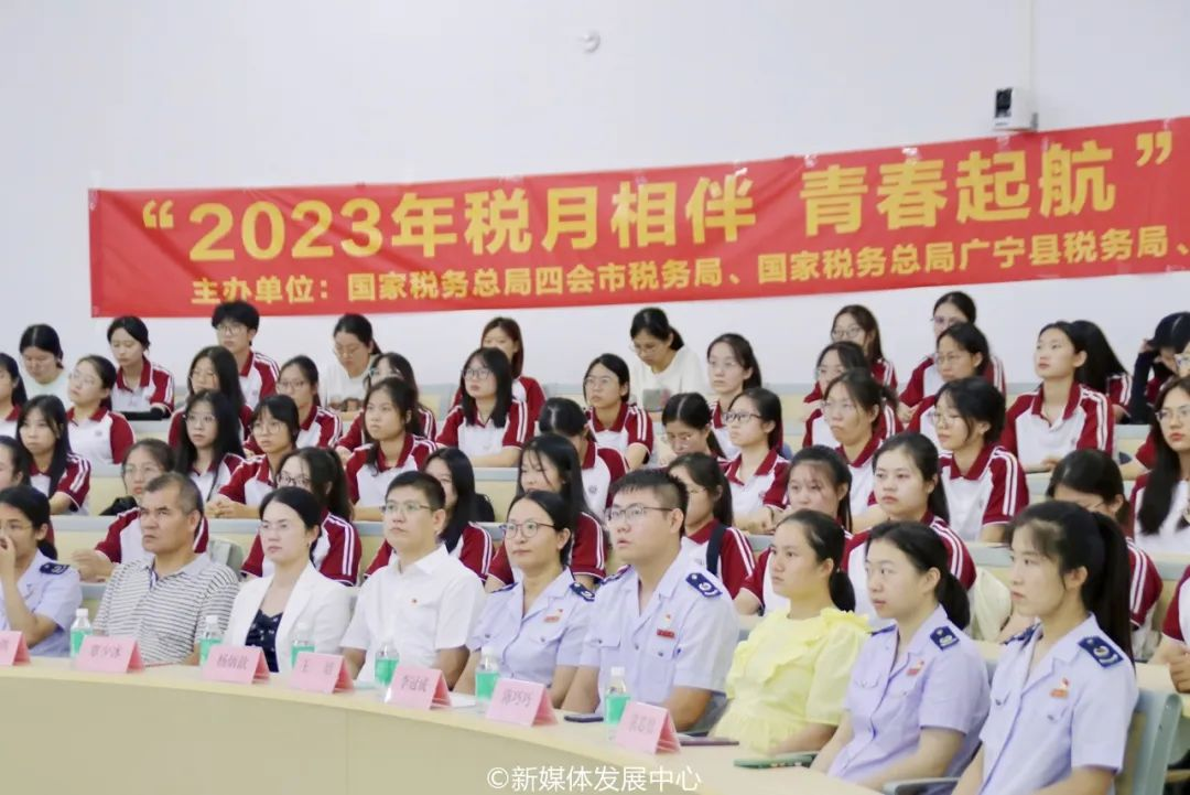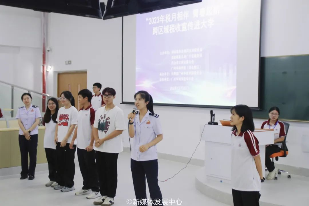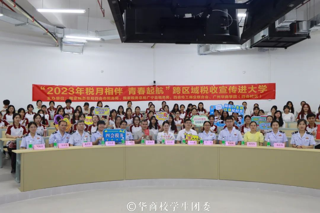 为助力大学生走稳走好创业就业第一步,推进校园税收普法教育和学生税收实践相融合,9月20日,国家税务总局四会市税务局、国家税务总局广宁县税务局、四会市工商业联合会联合我校开展的2023年“税月相伴 青春起航”跨区域税收宣传进大学活动顺利举办。3044永利集团登录校长助理、四会校区党委副书记、管委会常务副主任覃少冰,四会市税务局党委委员、副局长杨炳歆,四会市工商联会员部部长梁金洪,广宁县税务局第一税务分局局长王培以及税务局、工商联、3044永利集团登录(四会校区)相关工作人员参加本次活动。