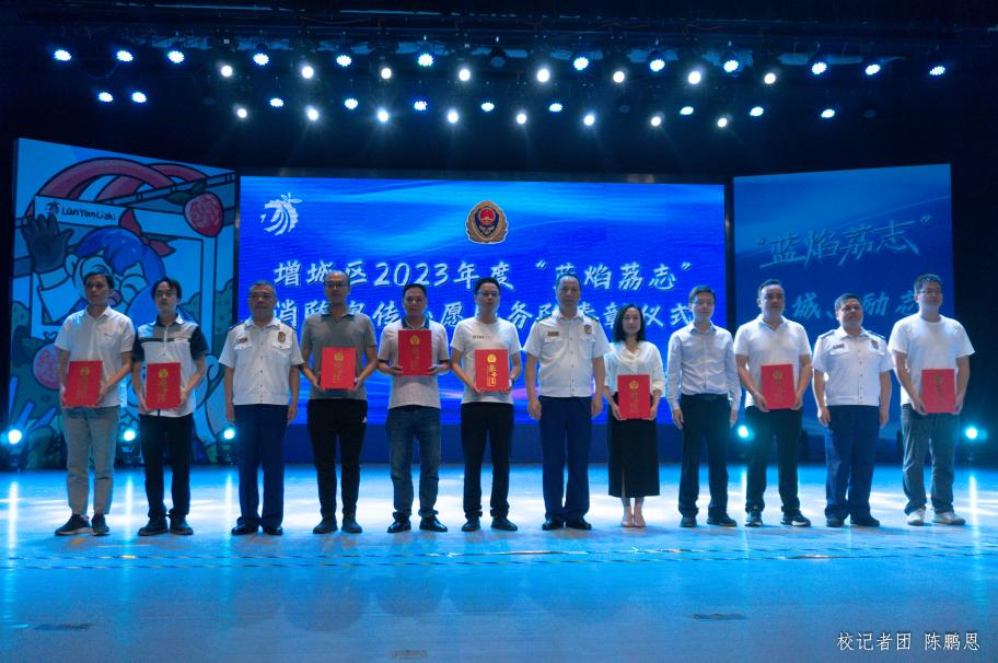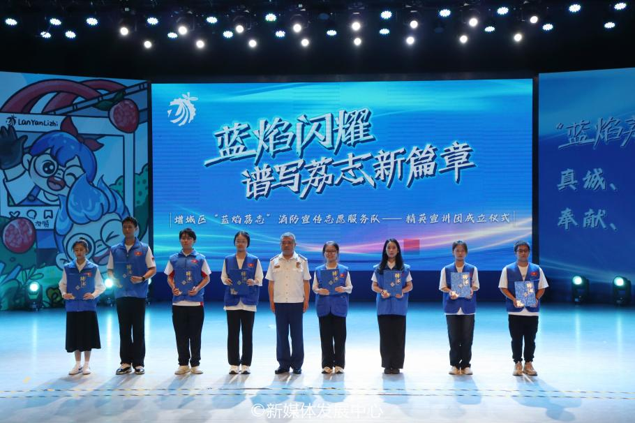 区消防救援大队大队长刘飞宣读《增城区“蓝焰荔志”精英宣讲团活动方案》并为宣讲团成员颁发聘书。他强调,宣讲团是传递消防安全知识的重要力量,要求成员们以高度的责任感和使命感,将消防安全知识普及到每个家庭。