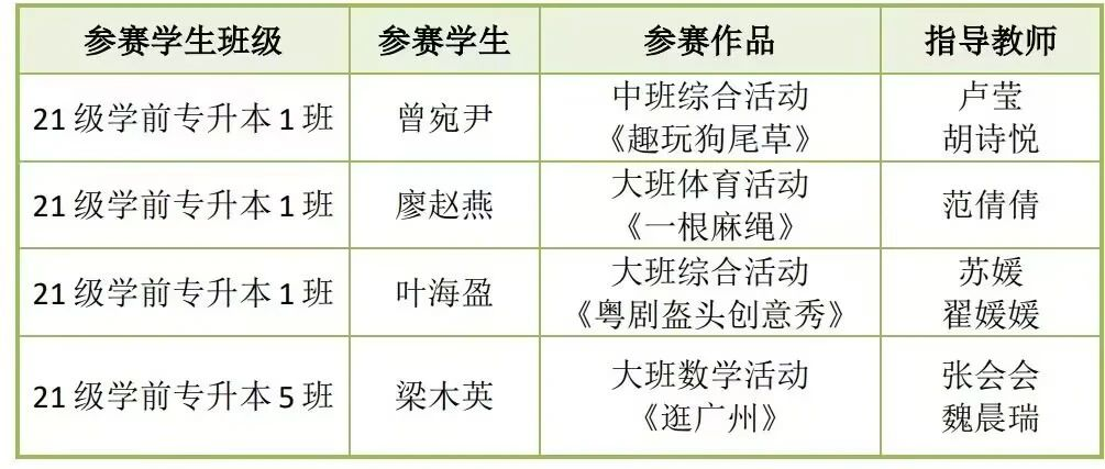 比赛当天,我校由学前教育系主任张建波教授和范倩倩老师带队前往华南师范大学石牌校区比赛现场。经过报到、抽顺序签、说课、模拟教学活动、现场答辩等环节,学前教育专业4名参赛选手曾宛尹、廖赵燕、叶海盈、梁木英凭借扎实的专业素养和教学技能,出色地完成了比赛。