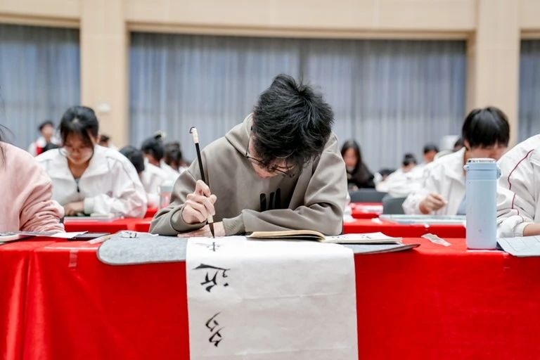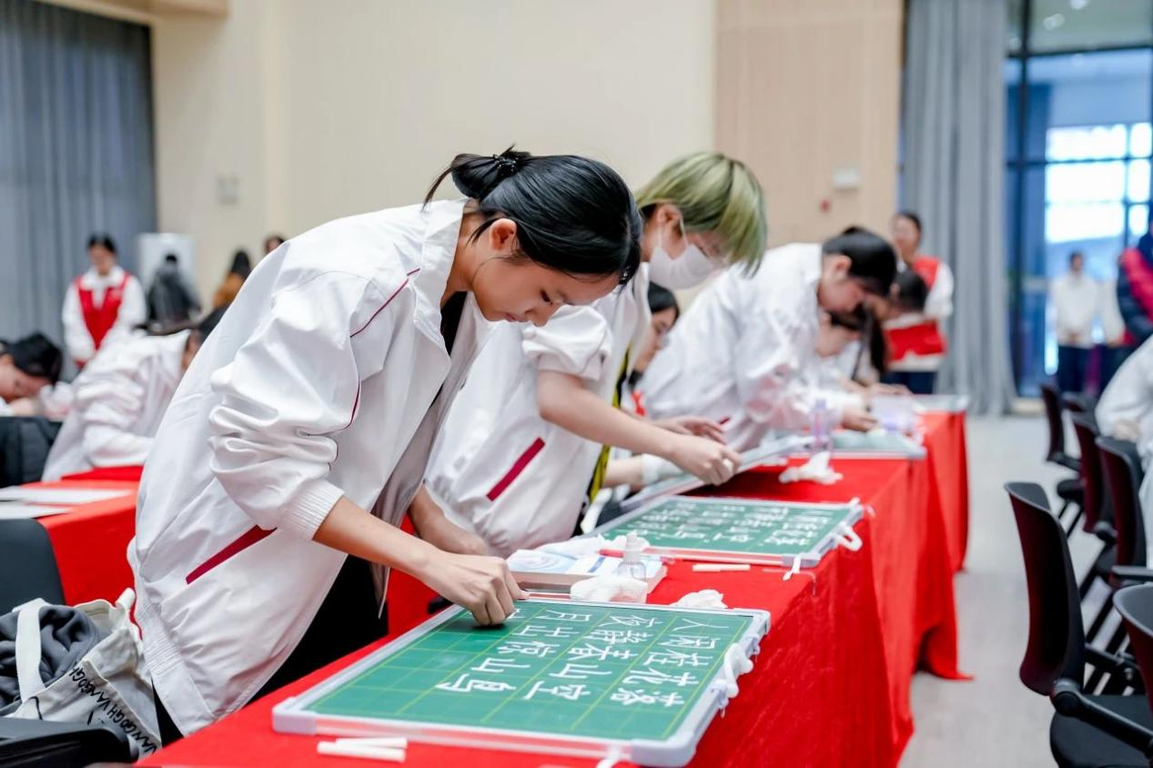 本次大赛共设三项比赛,分为毛笔组、钢笔组和粉笔组。参赛的同学们凝心聚气,用行云流水的笔画书写出青春积极的风范。