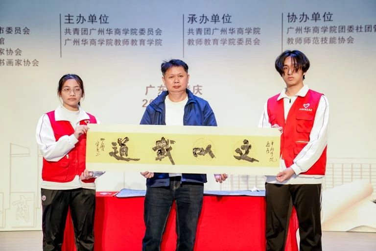 四会市书法家协会主席张广友现场即兴挥毫创作,呼吁同学们以赤诚之心对待书法,通过一笔一划沉心静气,磨练心智。