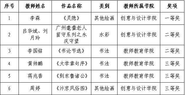 根据《广东省教育厅关于举办第七届粤港澳大湾区学校美术作品展暨第九届广东省高校美术作品学院奖双年展的通知》的安排,我校积极组织教师参与,涵盖了书法、绘画、水彩等多个领域,经省级复赛、现场评审,我校六位教师荣获一等奖1项,二等奖2项,三等奖3项。