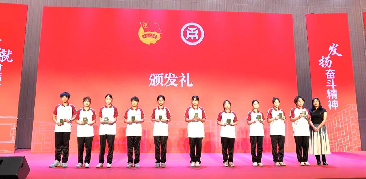 (团四会市委书记崔冰娜为新团员代表颁发团徽徽章和团员证)
