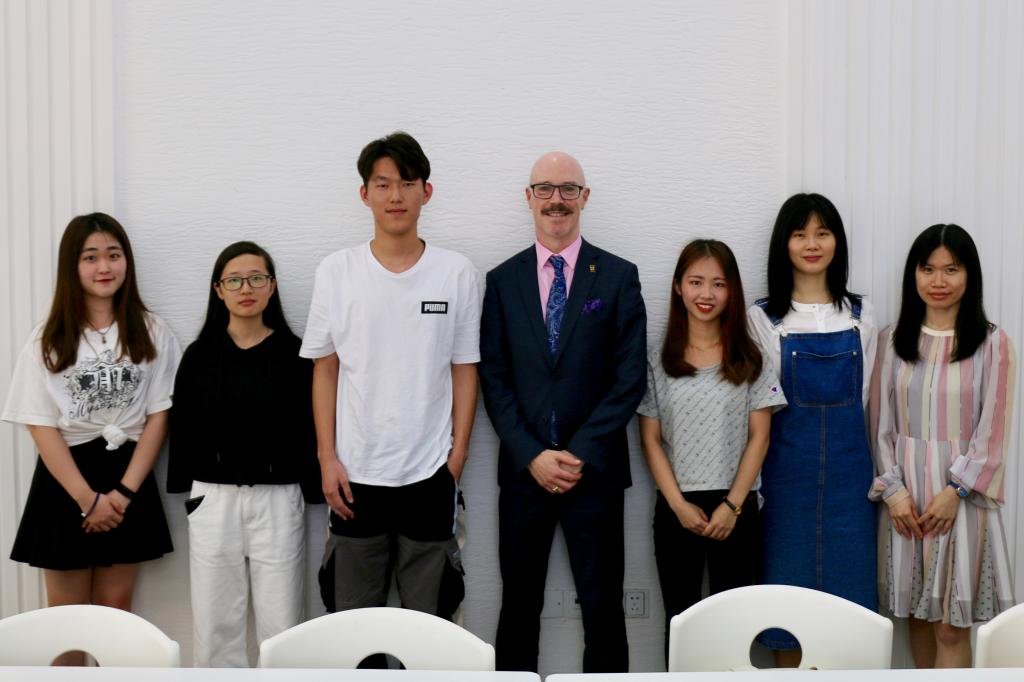 下午三点, Gauld教授与我校第四届国际精英计划十佳学生见面会谈。我校国际精英计划十佳学生在本年4月12月到奥塔哥大学参访,本次会谈是Gauld教授与同学们的第二次见面,同学们热情欢迎Gauld教授的到来。在会谈中, Gauld教授与同学们谈论对未来的规划,分享自己的想法,还谈及到中华文化与交流。同学们也介绍了我校的国际化教育氛围等。