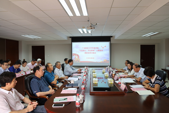 10月23日上午,在行政楼513会议室召开广东财经大学华商学院“不忘初心,牢记使命”主题教育调研成果交流会。参会人员分别有:省委教育工委主题教育第四巡回指导组周艳华组长、陈莉君老师、学校党政领导班子、主题教育领导小组全体成员。会议由党委书记苏宁同志主持。