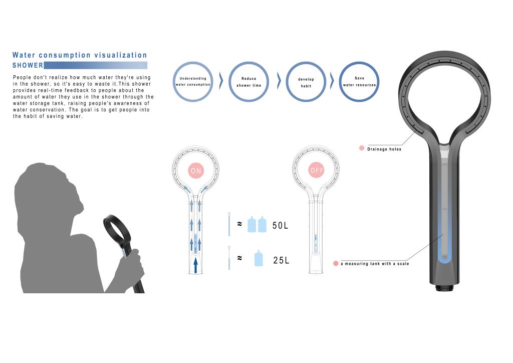 这个灵感是李同学在洗澡时想到的,他当时马上兴奋起来,想到市面上许多的节水花洒都是从花洒本身能够节水出发,他设想如果从培养人们的意识出发会不会有不同的效果,他希望让人们意识到每次洗澡的耗水量,当人们每次洗澡都看到自己原来洗澡的时候浪费了如此多的水是不是也会让人们适当的减少洗澡时间呢。李同学在一开始的方案基础上继续修改,然后参加了意大利A'DESIGN,最终也取得不错成绩。