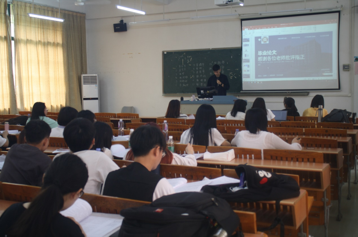 在论文答辩现场,气氛严谨认真。每名毕业生结合自己的论文先做一个约3分钟的自述,然后论文答辩小组的老师(以下简称小组老师)根据学生陈述的情况以及论文写作的情况对论文进行一个提问,再由学生对其进行答辩。除小组老师与毕业生外,传播与传媒学院团总支学生会为答辩进行记录、计时、整理等系列工作。期间,不时还有该系19级的学生进现场旁听。她们对此次旁听感觉获益良多:对答辩的形式和准备有了更深入的理解,并表示会在空余时间为两年后的答辩进行相应准备以应对老师犀利的问题。在学生完成答辩后,论文答辩小组老师进行讨论。尔后,宣布答辩需大改及不通过需准备二辩的同学名单。