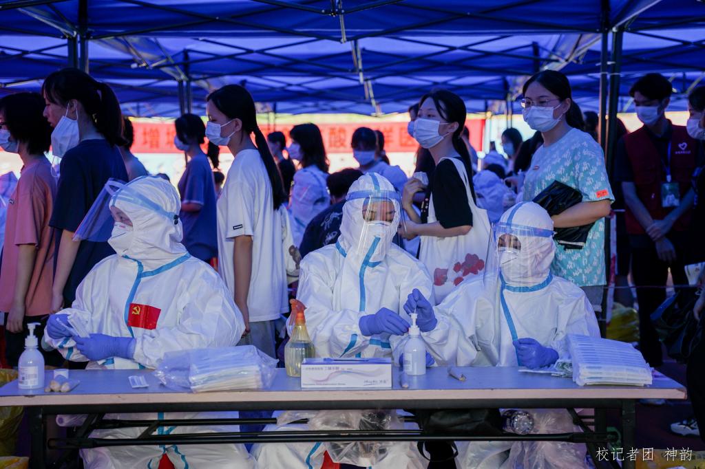 检测现场,大棚内身着白色防护服的医护人员熟练地进行咽拭子标本采集工作,后勤警卫员维持着检测会场的秩序,志愿者们身着红色马甲疏导前来检测的人员筑成坚实后盾。参与检测的师生积极配合现场工作人员展开工作,在志愿者的指引下有序排好队伍、紧跟检测流程,检测现场井然有序。