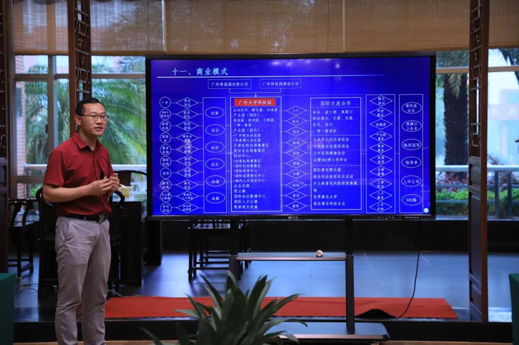 广东孵客科技孵化集团副总裁路斌先生介绍大学科技园的运营模式。他以创新创业示范校为例,从共生型生态系统、商业模式、项目优势、建设目标等多个方面进行介绍,其意愿是面向全球,开放联合,打造价值共生的生态型国家大学科技园,推动高校科技成果转化和创新人才培养。同时,路斌先生针对增城区情况,提出大学科技园要加大对外招收力度,聚拢增城区高校创业人才,吸收优质项目。
