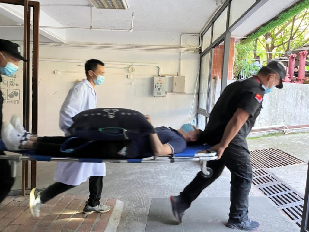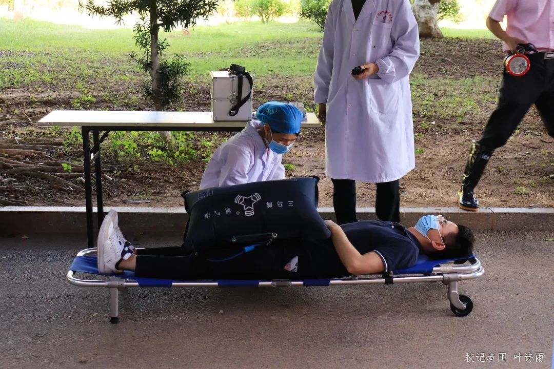 疏散基本完成,安全保卫组进入现场进行复查,发现一名学生因脚踝受害,暂未撤离,立即联系救护组组长救援,使用担架,将受伤学生转移到安全区域。校医务室接到通知后,立即赶往现场救护点待命,对受伤学生进行检查后送院治疗。