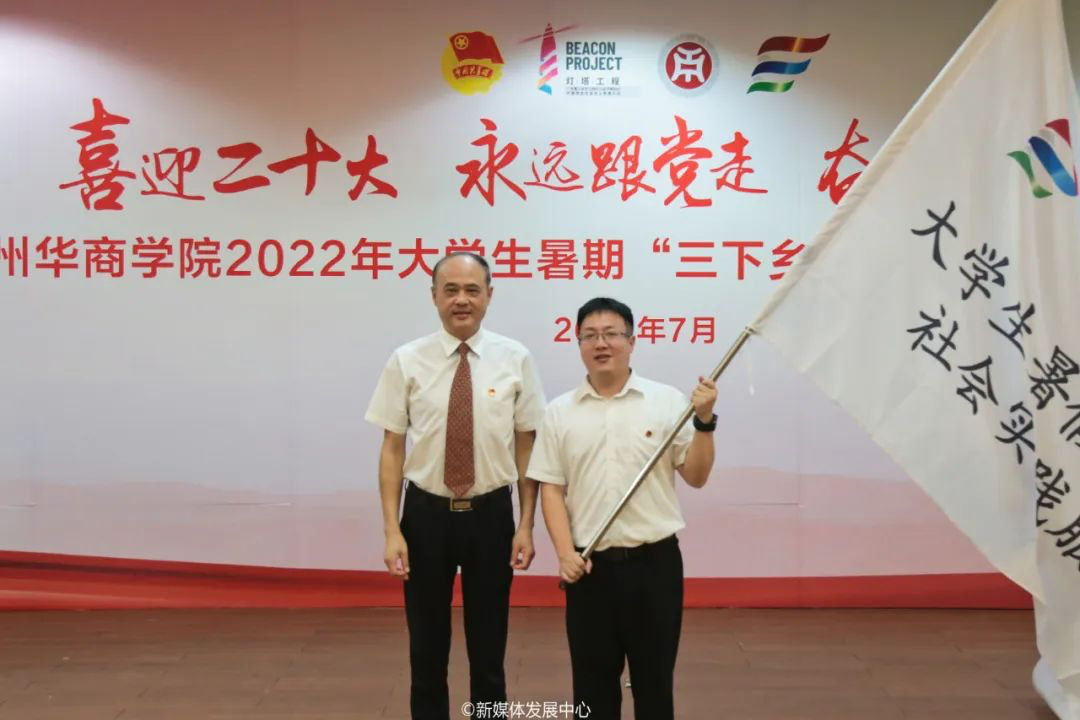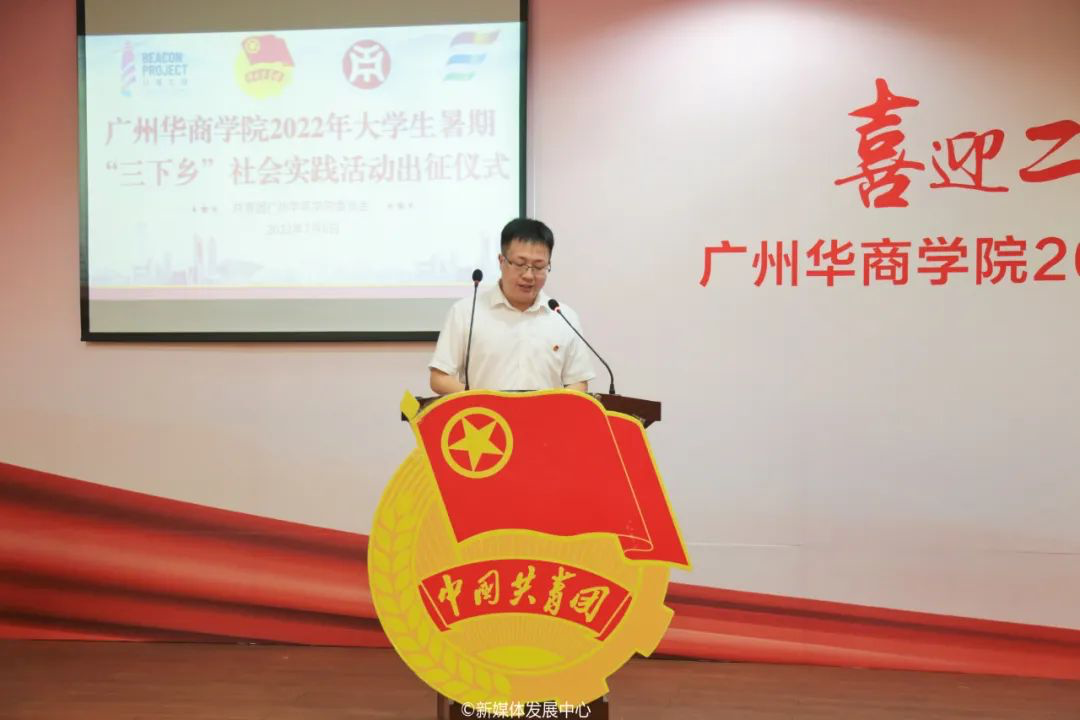 为深入学习宣传贯彻习近平新时代中国特色社会主义思想,贯彻落实习近平总书记关于青年工作的重要思想,深入学习习近平总书记在庆祝中国共产主义青年团成立100周年大会上的重要讲话精神,引导和帮助广大青年学生上好与现实相结合的“大思政课”,努力成长为担当民族复兴大任的时代新人,引领教育广大青年学子在社会实践活动中“受教育、长才干、做贡献”。校团委组织开展以“喜迎二十大,永远跟党走,奋进新征程”为主题的2022年大学生志愿者暑期“三下乡”社会实践活动。7月6日18:00,2022年大学生暑期“三下乡”社会实践活动出征仪式在增城校区图书馆一楼学术报告厅举行并在四会校区2号楼215同步进行直播。大会由校团委陈刚副书记主持。