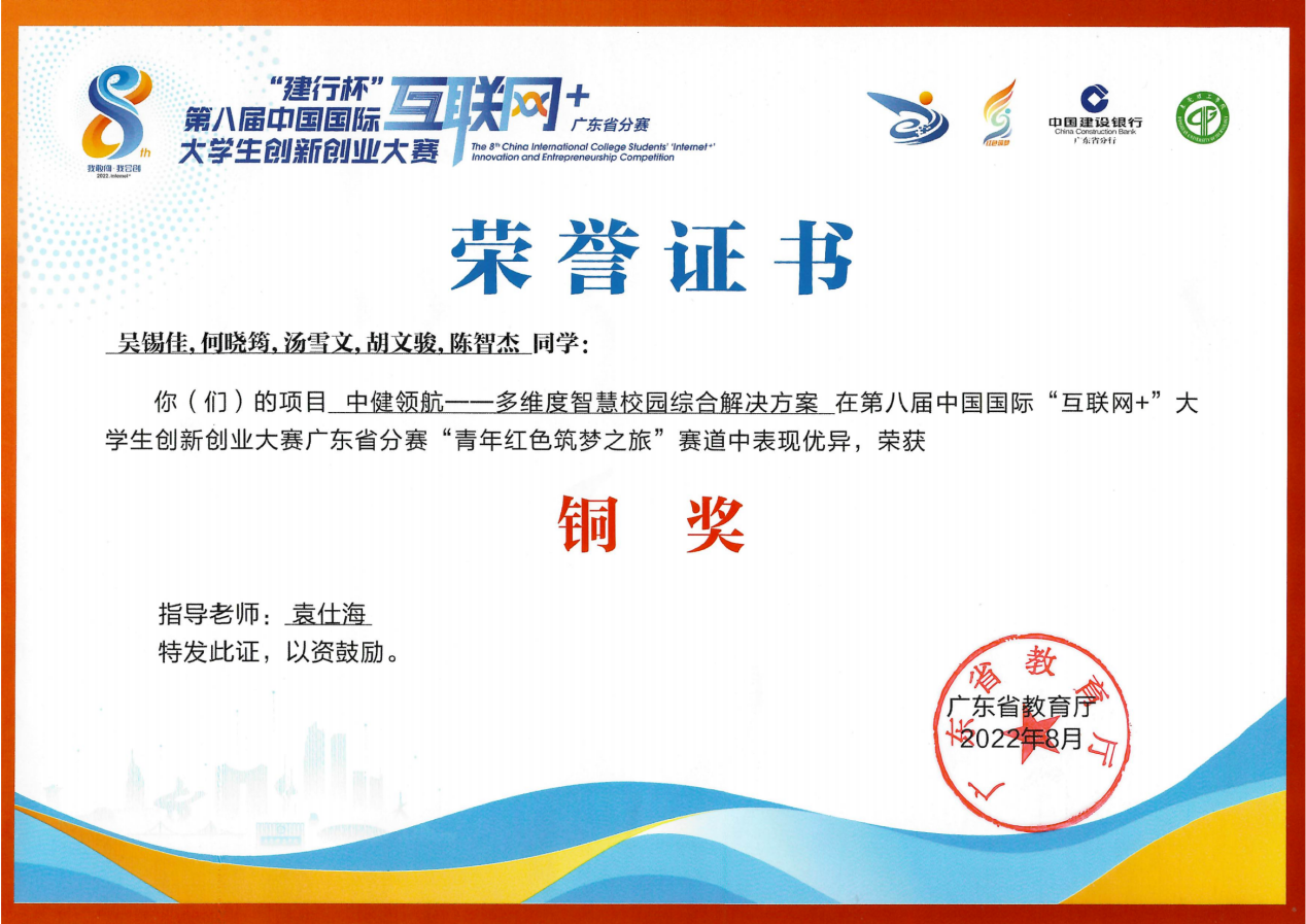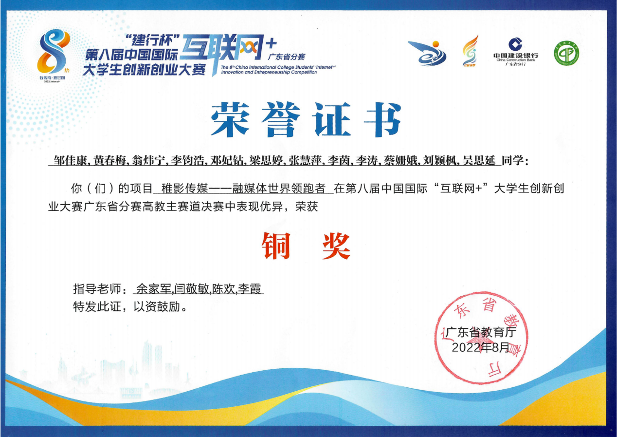 近日,“建行杯”第八届中国国际“互联网+”大学生创新创业大赛广东省分赛决赛在东莞理工学院松山湖校区圆满落幕。经过激烈角逐,我校《稚影传媒—融媒体世界领跑者》和《中健领航--多维度智慧校园综合解决方案》项目喜获铜奖。