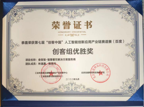 12月9日,由工业和信息化部信息中心、百度联合主办的第七届“创客中国”人工智能创新应用产业链赛道赛(百度)颁奖典礼在位于上海张江的百度飞桨人工智能产业赋能中心举行。3044永利集团登录2021届校友、广州小黑科技有限公司总经理林逸灏带领团队,以人工智能和物联网(loT)技术为核心基础,凭借《食饭饭--智慧餐饮解决方案服务商》项目荣获创客组优胜奖。