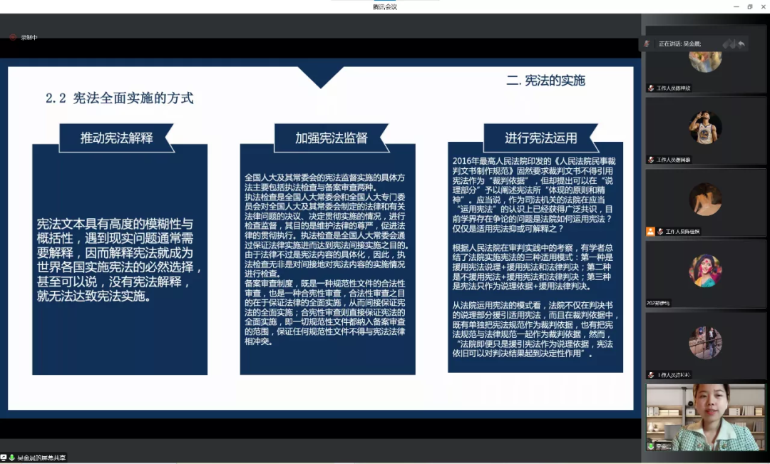 吴金晨老师的讲座主要分为三个部分:宪法基本内容、宪法的实施、以案释法。具体说来涵盖了从宪法的发展历程、宪法重要法条、维护宪法尊严、保障宪法实施、案例分析等。宪法是国家的根本大法,是治国安邦的总章程,具有最高的法律地位、法律权威、法律效力。吴老师重点阐述了宪法的定义、宪法修改的意义、尊崇宪法与践行法治等方面内容,生动讲解了学习宪法的重要意义和作用。