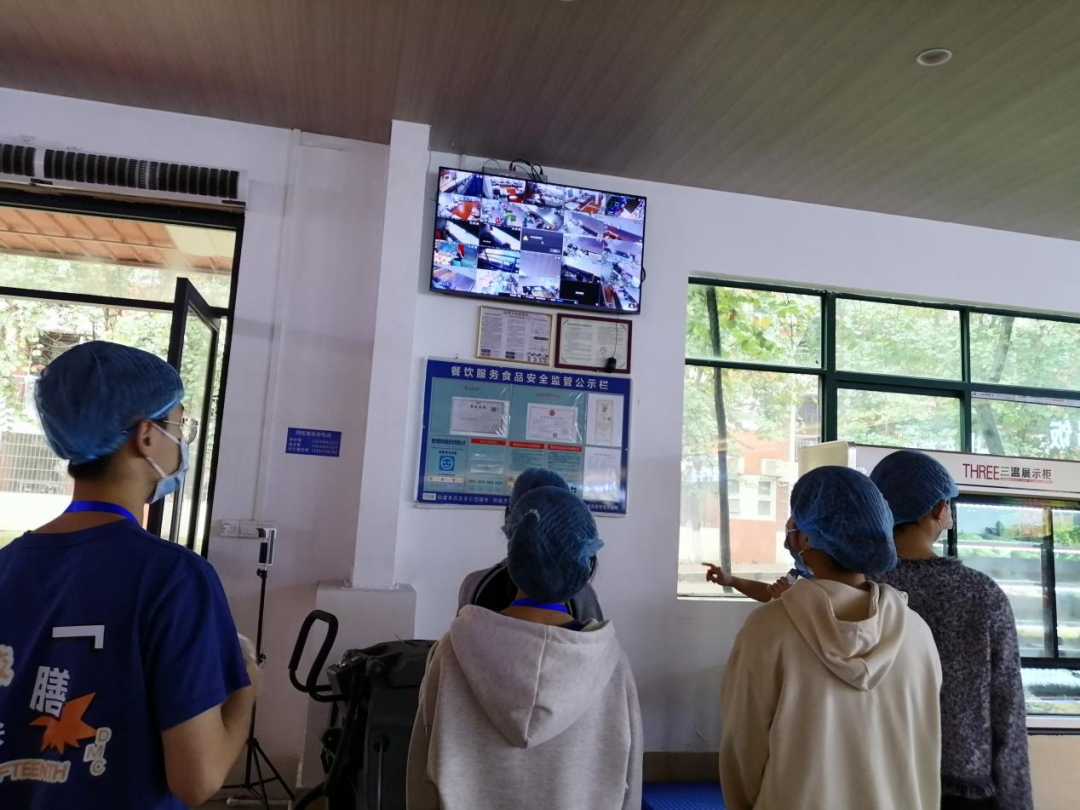 按照食堂的要求,学生代表们在食堂工作人员的带领下,戴上口罩和头套,走进第四食堂留样间、仓库、冷藏库、粗加间、烹煮间、洗消间、明厨亮灶等区域进行参观学习。