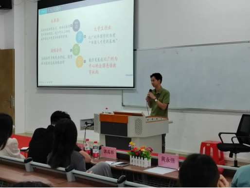 讲座伊始,黄永强以广州市未来佳教育科技有限公司为例给参会同学分享项目计划书模板。他从“公司介绍、商业环境分析、产品与服务、营销策略、公司战略和营销模式、财务分析、风险管理、未来规划”等八个方面详细讲解了如何写好一份优秀的项目计划书。