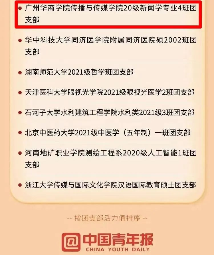 我校传播与传媒学院20级新闻学专业4班团支部入选2022年度全国高校“活力团支部”最具组织力TOP100榜。