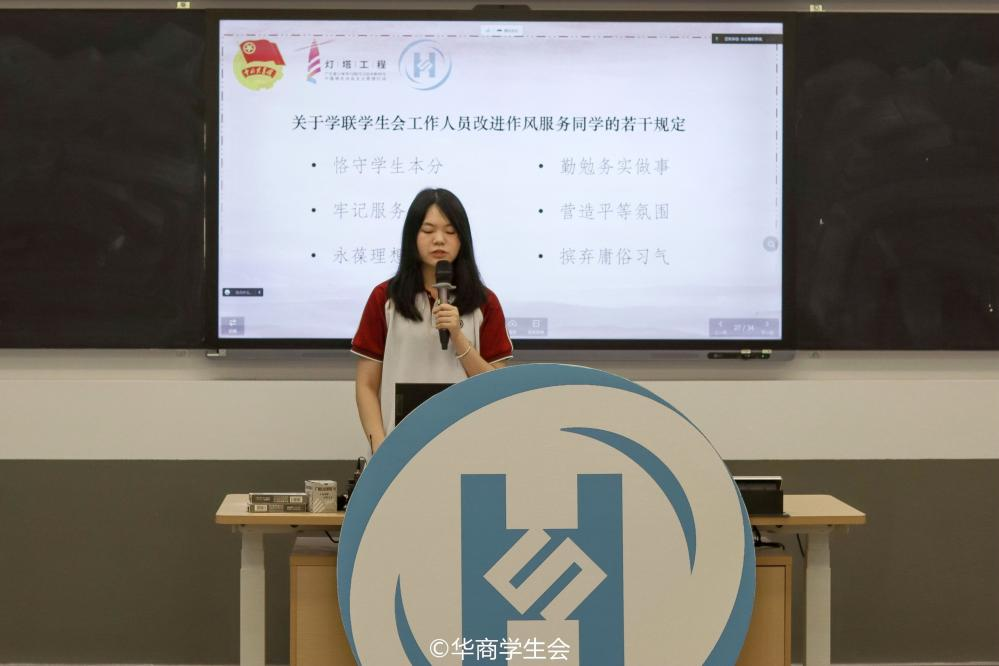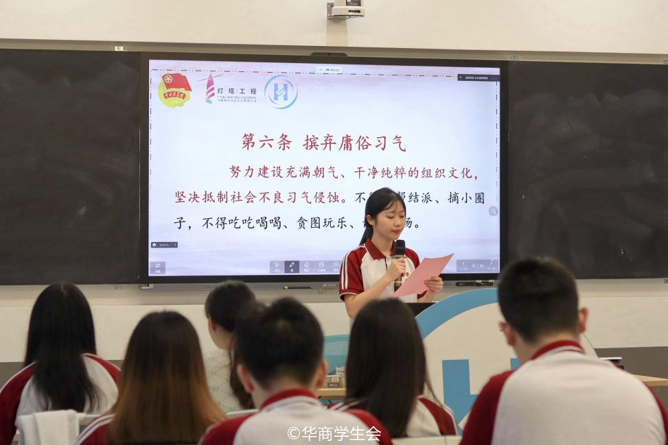 校学生会主席团成员黄朵懿领学《关于学联学生会工作人员改进作风服务同学的若干规定》。她从恪守学生本分、牢记服务宗旨、永葆理想情怀、勤勉务实做事、营造平等氛围、摈弃庸俗习气等六个方面展开,联系青年学生群体普遍特点,以“青年与青年对话”的形式,明确学生骨干的使命与责任,提出工作人员应严于律己、争当表率,共同打造有秩序、有温情、有成效的学生会组织。