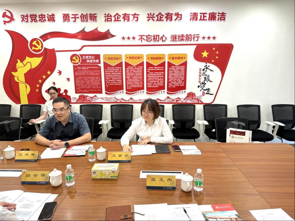 会议开始,双方在广州农商银行会议室进行座谈交流。数字金融学院领导对江炜琳行长一行人的热情接待表示感谢,并简要介绍了数字金融学院人才培养计划、学院的基本情况以及此本次走访主要目的是加强校企合作,希望与广州农商银行进一步深化交流合作,拓宽毕业生实习就业渠道,为银行输送金融专业人才,共同推动金融人才的培养与发展。