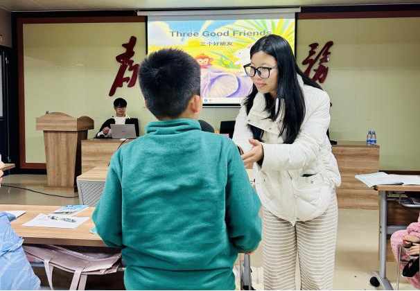 活动第二项为“英语趣味小游戏”。志愿者们设计了“单词记忆大挑战”“单词联想”“英语绘本阅读”“观看英语小视频”等互动环节,同学们通过回答问题赢取积分奖励。在游戏过程中,同学们踊跃回答问题,从中学到了单词与语法表达等知识。