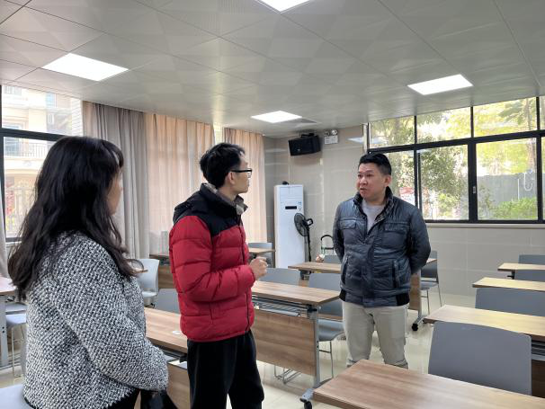 上午,外国语学院副院长何顺发、项目负责人郭宇洁以及辅导员孔翊先一同前往清燕社区进行走访与交流。清燕社区居委会书记邓镜波同志对“晚风学堂”项目的筹备表示欢迎,并介绍了社区青少年的教育现状和课后辅导需求。外国语学院一行实地考察了社区活动场地,包括社区服务站、青少年活动中心等潜在的活动场所,对场地的布局、设施配备以及周边环境进行了全面了解,并就场地的合理利用与社区工作人员进行了深入探讨。