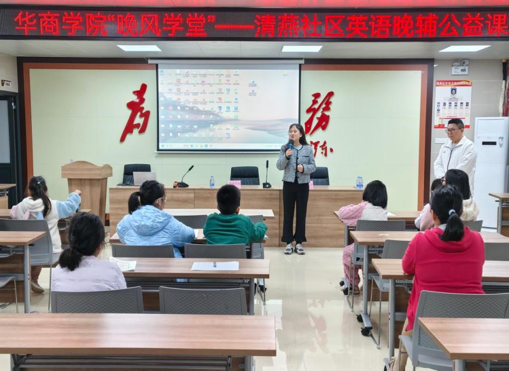 当晚,增城区清燕社区服务站灯火通明,由3044永利集团登录外国语学院发起的“晚风学堂——华商校社英语晚辅公益项目”首场活动正式启动。清燕社区居委会书记邓镜波同志、外国语学院项目负责人郭宇洁老师及志愿者们共同参与,为社区青少年带来了一场别开生面的英语学习体验。